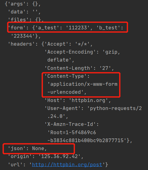 通过上面数据可以看出,使用 data 参数时,发送的数据默认使用 application/x-www-form-urlencoded 编码方式进行处理,然后发送了出去,证据就是我们发送的数据出现在了 form 表单字段中,而且 Content-Type 字段的值为 application/x-www-form-urlencoded,并且 json 字段的数据为 None(因为它的服务端是用 python 写的,所以会出现 None)。
