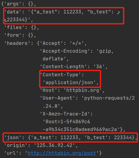 我们使用同一个字典,使用 data 参数和 json 参数分别发送同样的数据,来对比数据是如何被处理的,以及被处理的结果。先看打印出来的返回值: