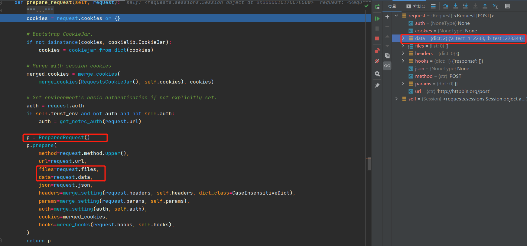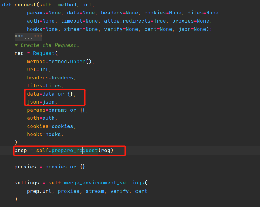session.request中,这个方法有很多参数,平时我们所用到的参数在这里都有了。我们可以看到,data 和 json 参数被传进来以后又被传到了 Request 这个类中, 新建了一个 Request 的对象,然后调用 prepare_request 函数进行了处理,我们有理由相信,prepare_request 这个函数里边会对我们传进来的 data 和 json 参数进行处理。