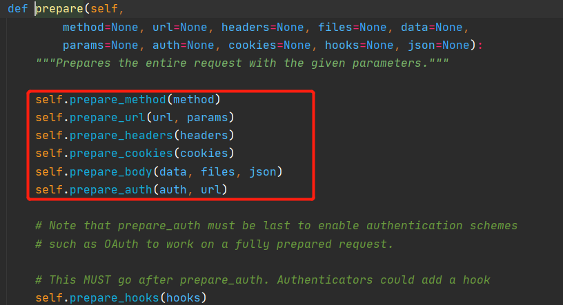 - 进入到 prepare_request 函数中,可以看到,传入进来的 request 对象的实例变量的值又被传入到了 PreparedRequest 类的 prepare 函数中进行了处理,处理完成后返回了 PreparedRequest 对象。我们跟进到 prepare 函数中