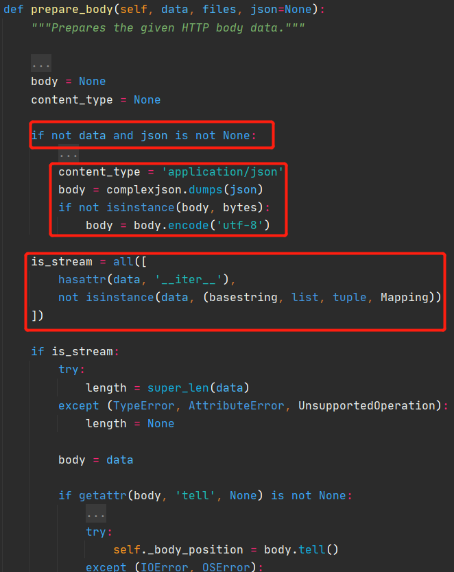 self.prepare_body函数中查看我们感兴趣的data/json数据是怎么被处理的。