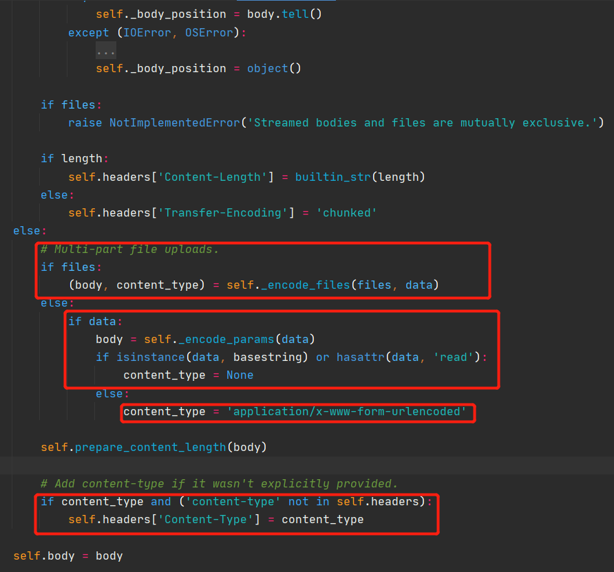 - 跳过处理 data 流的过程,首先进行了 files 是否为 None 的处理,如果有文件就需要读取文件并且编码。如果没有的话处理 data 参数,通过