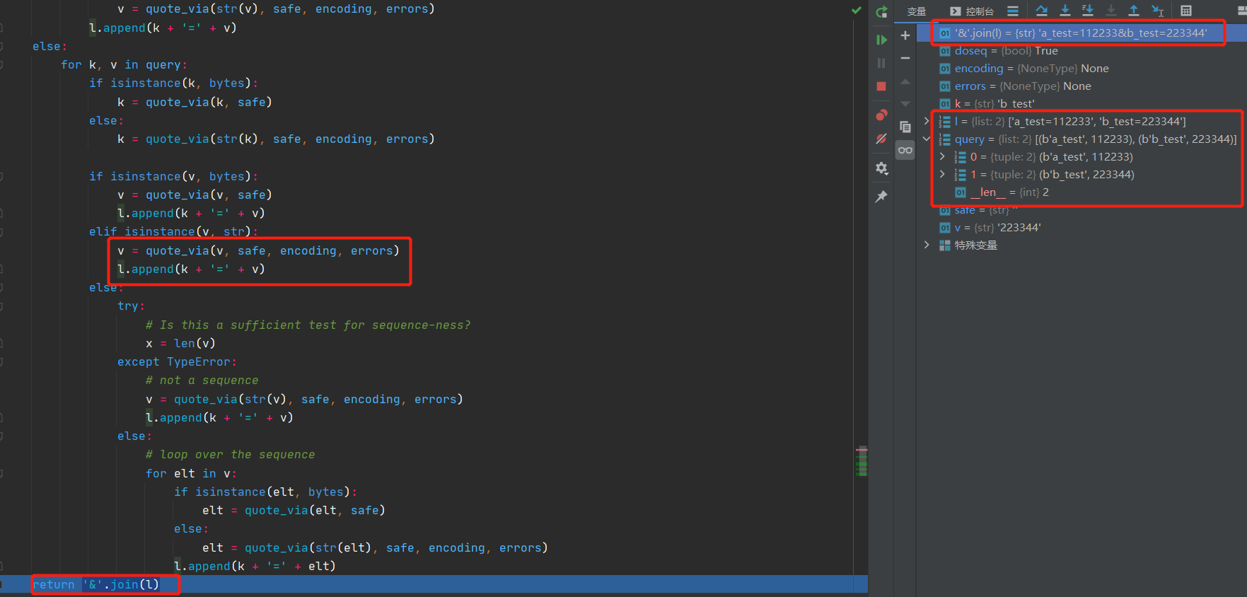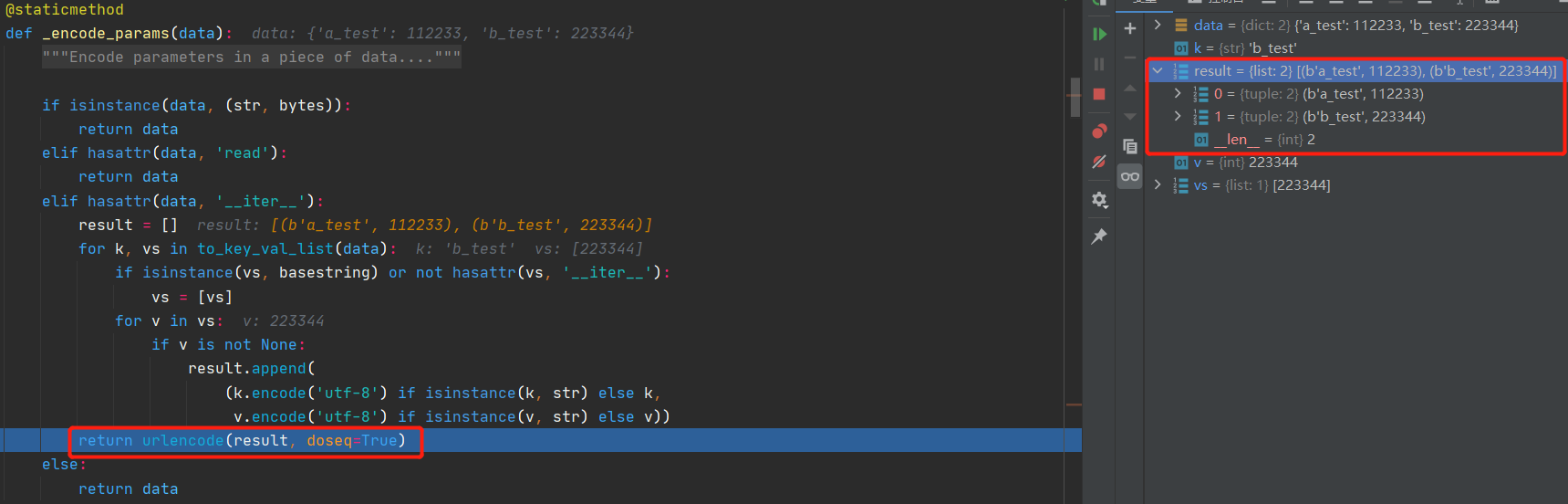 self._encode_params函数,通过各种类型判断,最后将数据转换为列表,列表中是由 key/value 组成的元组,最后调用系统的 urlencode 函数将 result 中的数据转换为最终发送出去的数据。