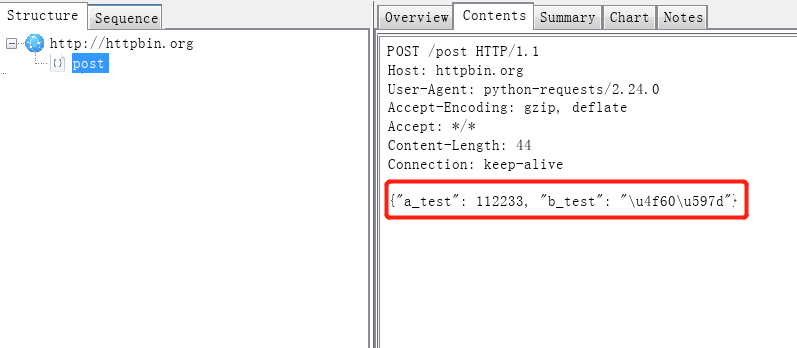 接下来看使用 json 参数发送的数据,Content-Type 字段的值为 application/json,证明是通过 application/json 编码发送的数据,并且数据出现在了 json 字段中,证明服务端正常收到了 json 类型的数据并且可以正常处理。