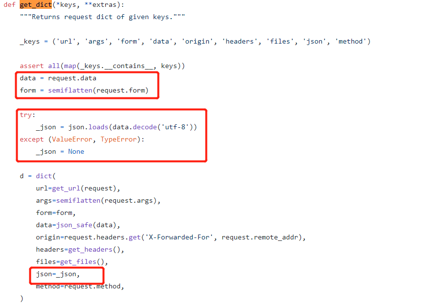 可能有小伙伴注意到数据还出现在了 data 字段中,由于不清楚服务端是怎么样的处理逻辑,为什么发送的 application/json 编码的数据会出现在 data 字段中,这里暂时不做深究,感兴趣的小伙伴可以尝试到它的 GitHub 上看源代码找找答案。