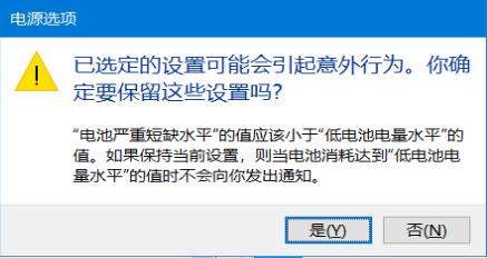 经过查询和测试发现,关键电池电量是底线,也就是说电池电量水平低所设置的值不能低于这个值。如果关键电池电量低于了电池电量水平所设置的值,会有如下提示: