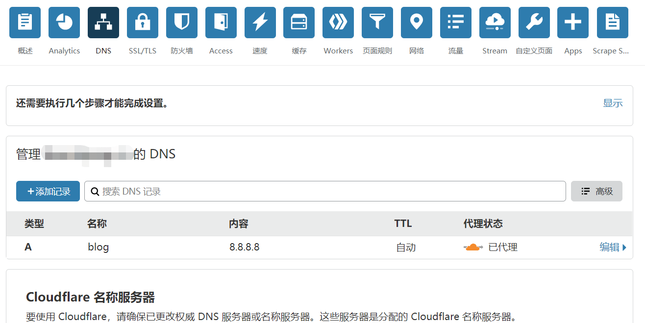使用 Cloud flare 的第一步是将 DNS 解析服务器改成 Cloud flare 的地址。进入 Cloud flare 网站:https://www.cloudflare.com/ 。注册登录就不说了,点击 Add Websites,输入需要进行重定向的顶级域名,然后会扫描你域名的 DNS 记录,扫描完成后下一步。检查 DNS 记录是否缺失,缺失的自己加上就好。然后继续,选择免费套餐,土豪随意。进入到 DNS 解析服务器地址更改的界面。这里需要去你的域名服务商去更改域名的 DNS 解析服务器的地址,更改为 Cloud flare 的地址,这样的话 Cloud flare 才能控制你的 DNS 请求。改完之后域名就添加好了。