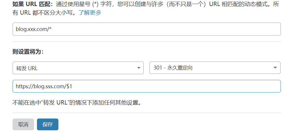 图中的 *和 $1 是通配符,负责处理 URL 的。然后点击保存就可以了。