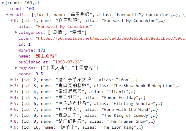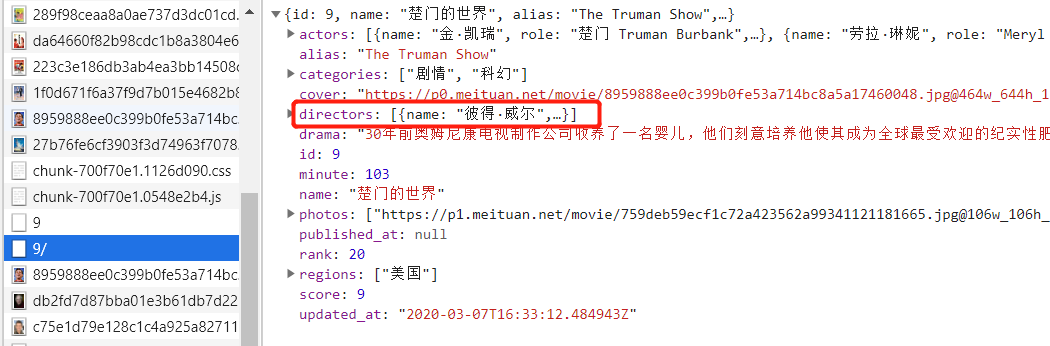 查看数据,基本数据都有了,但是没有作者信息,随便点击一个电影,查看详细信息,查找接口。