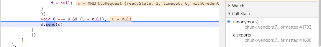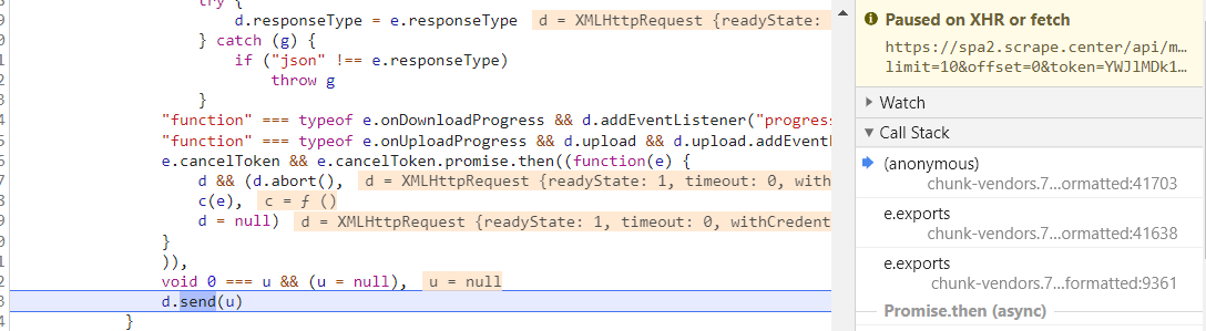 下断点,凡是包含 token 字符串的 URL 全部会断下,刷新页面,断点断下,格式化 js 代码,可以看到断下的位置为 send 函数,用来发送请求。