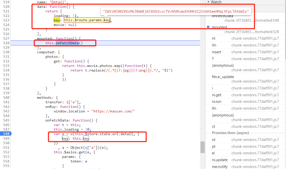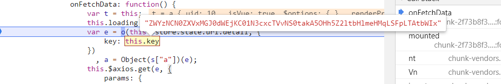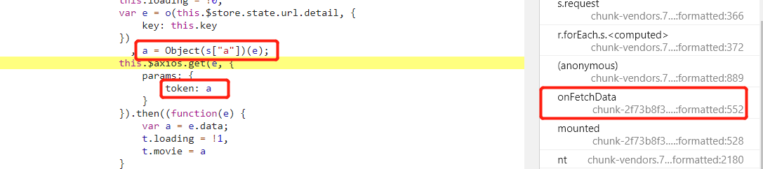按照右侧调用栈依次往下看,发现在 onFetchData 函数附近发现了 token 参数,取消 URL 断点,在 token 的生成位置下断点。重新刷新页面,断点断下。