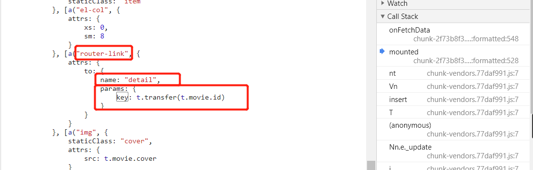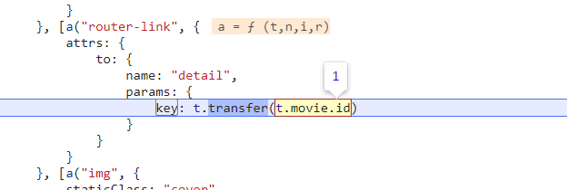 一共 9 个匹配,挨个找也不多,其他的都排除掉了,找到了这个,熟悉的 router-link(这不是 vue 中生成 a 标签方法嘛),熟悉的 detail(URL 中包含这个字符串),熟悉的 key,应该是它没错了,下断点,刷新页面。