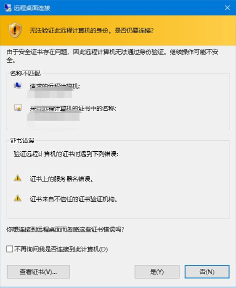 第二个红色方框中为 TLS 握手包,其中最后一个数据包标红了,因为连接被 RST 了,具体为什么被 RST,猜测可能是我们在使用远程桌面时常见的证书错误(见下图)