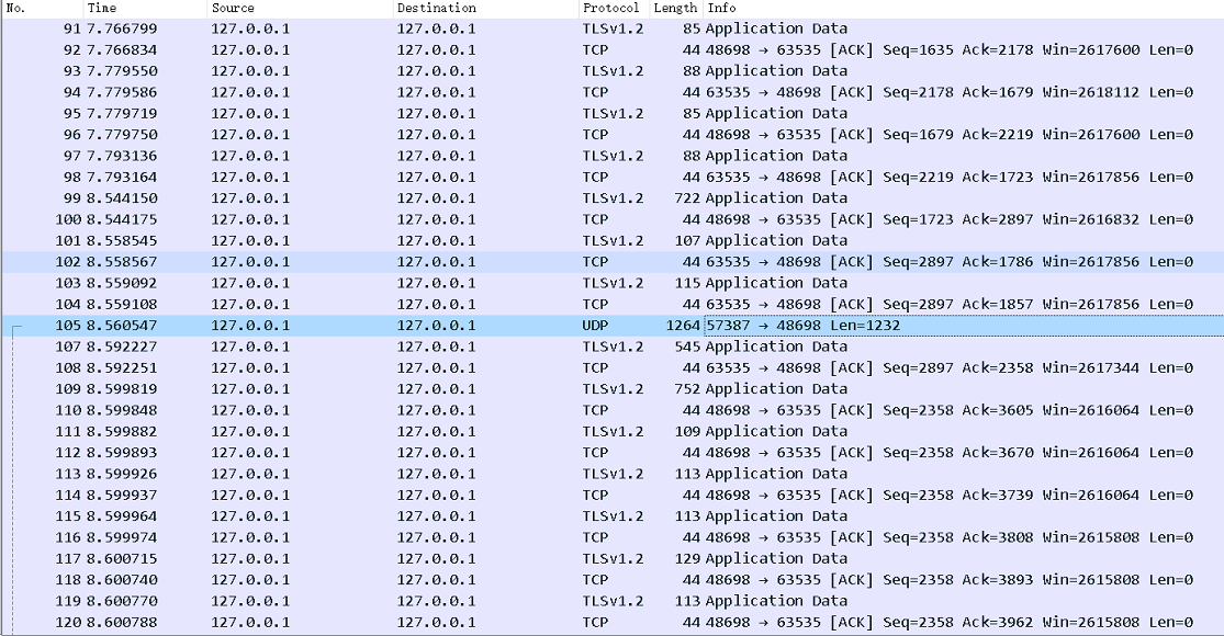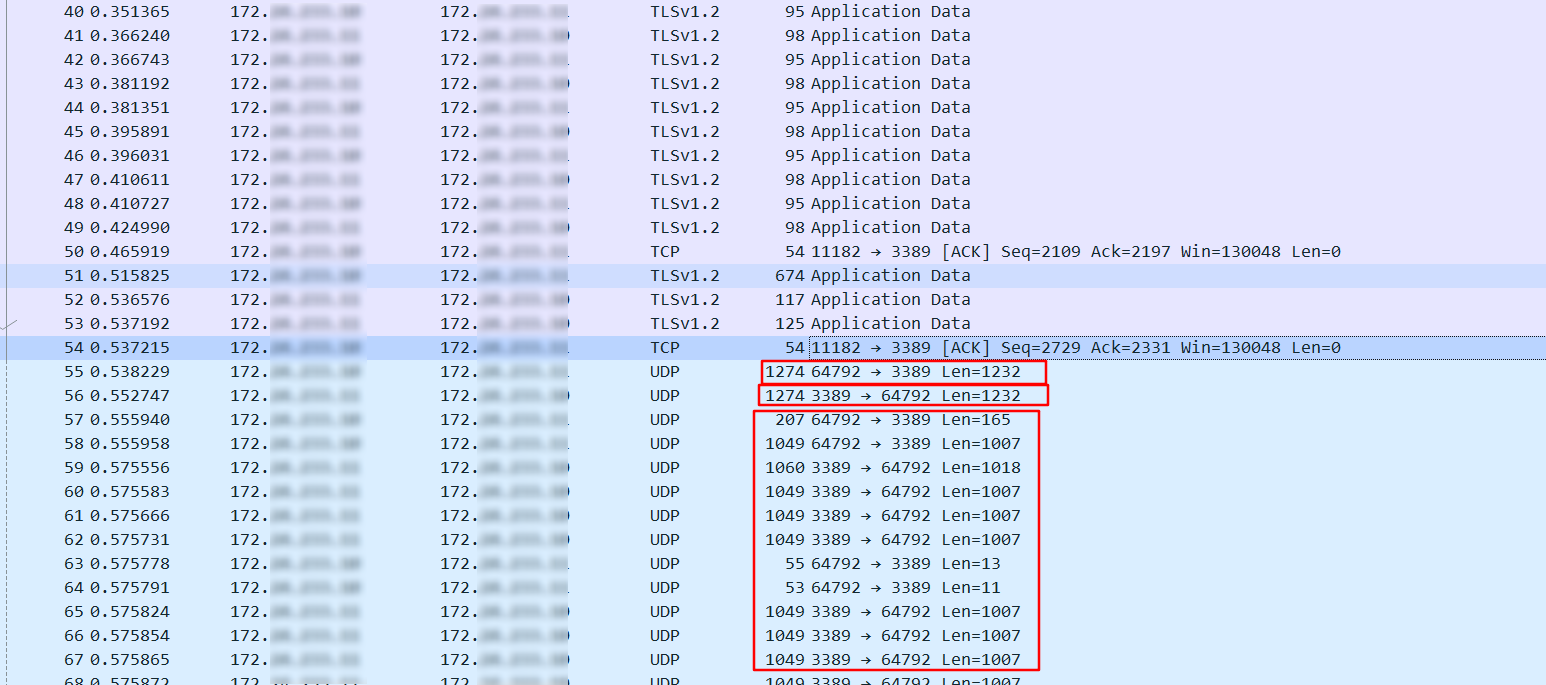 前边都是正常的 TCP 握手和 TLS 握手数据,就不截图了,主要看图中选中的这行 UDP 数据包,由本地的 57387 端口发送到服务器的 48698 端口,但是没有接收到服务器的回应,远程桌面客户端认为与服务器的 UDP 通信不成功,所以下面的通信仍然由 TLS 隧道来传送。