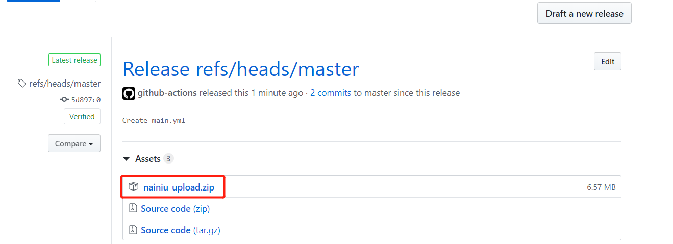 稍等一会,构建完成后,成功了,我们去 release 界面查看,发现我们已经创建了一个新的版本,并且也成功上传了对应的 zip 文件。