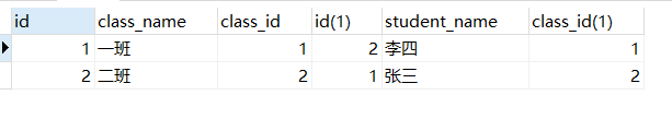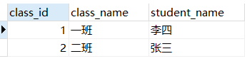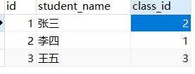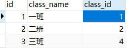 现在有两张数据库表,第一张图片为student表,第二张图为class表,他们之间通过class_id这个字段可以联系起来。