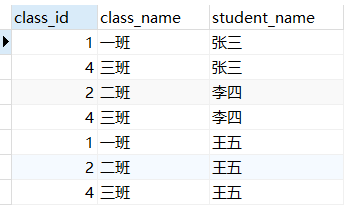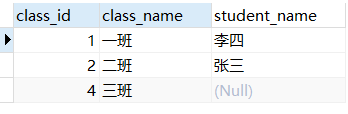 可以看到,这里用左连接查询显示了所有的班级,但是在学生表中找不到班级id为4的学生, 所以三班的学生名字字段显示为空。