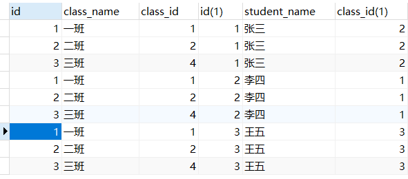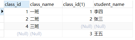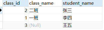 可以看到,这里显示出了所有的班级和所有的学生。由于没有学生是三班的,所有id为4的班级学生名字这一列为空。由于没有id为3的班级,所有班级id为3的学生对应的班级名字列为空。